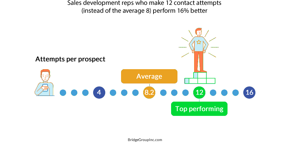 Sales development reps who make 12 contact attempts (instead of the average 8) perform 16% better. (Bridge Group, 2016)